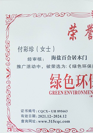 公司以绿色环保、关注健康生活的理念为企业发展的重点,凭借雄厚的实力和现金的生产技术,占据的嘉兴多半的市场,并逐步像嘉兴周边地区扩展,因本厂致力于产品自主创新,注重健康生活的需求,曾获得过“中国绿色环保产品证15、中国室内门行业优秀品牌、中国室内门质量放心企业、国家标准合格产品”等等。